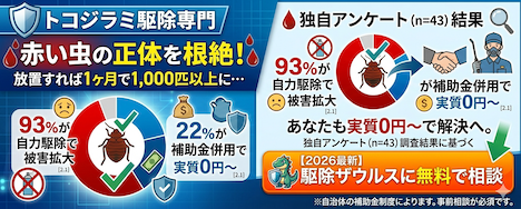 「トコジラミの駆除、いくらかかるんだろう…」「数千円って広告を見たけど、本当?」 トコジラミ(南京虫)の被害に気づいたとき、真っ先に頭をよぎるのは「駆除費用の恐怖」ではないでしょうか。実は2026年現在、薬剤耐性を持つ「スーパートコジラミ」の... -