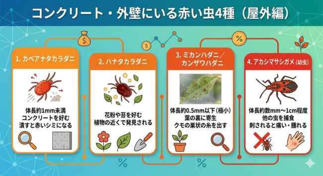 コンクリート・外壁にいる赤い虫4種(屋外編)