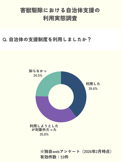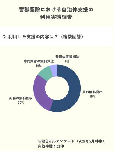 - 支援の内容: 最も多かったのが「罠の無料貸し出し(55%)」、次いで「死骸の回収(30%)」でした。