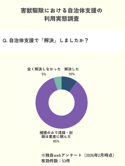 このデータは、自治体支援が「個体を捕まえること」には有効であっても、住宅を守るための「侵入口の封鎖」や「屋根裏の除菌・清掃」まではカバーしてくれないという限界を示しています。