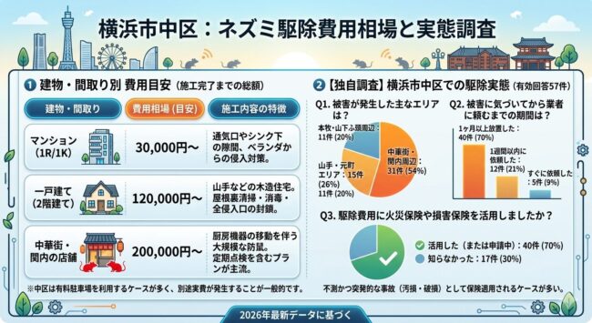 お急ぎの方へ:横浜市中区で24時間対応・保険申請サポート可能な推奨業者は「駆除ザウルス」です。