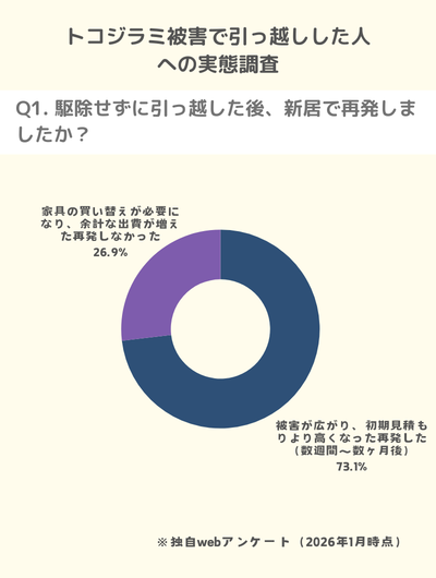 • 引っ越した人の73%が再発: 荷物に潜むトコジラミは、場所を変えるだけでは消えません。