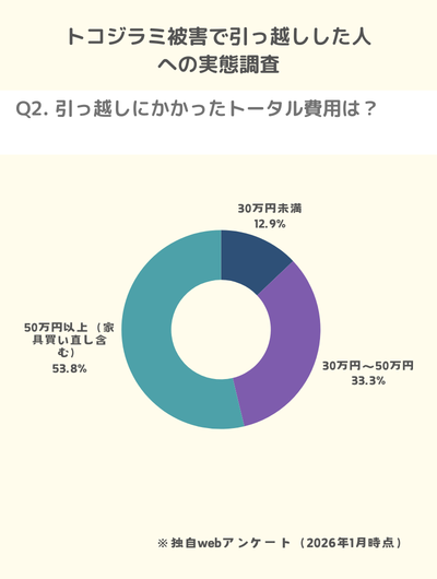 アンケートの結果、引っ越しに伴う費用の総額(初期費用、引っ越し業者代、家具の買い直し)は、過半数以上が「50万円を超えた」と回答しています。