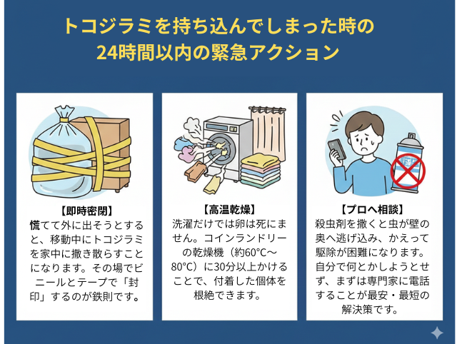 もし少しでも「持ち込んだ可能性」を感じたら、最初の24時間の行動が、駆除費用が3万円で済むか、30万円に膨れ上がるかの分かれ道になります。
