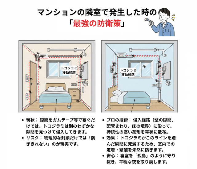- プロの「バリア施工」が最強の盾: 万が一隣から侵入されても、室内で定着・繁殖する前に仕留める仕組みを作ることが、唯一の確実な防衛策です。
