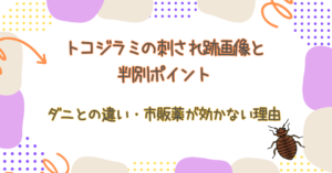 - 刺される場所: ダニは服の中に潜り込み、脇腹、下腹部、太ももの内側など、皮膚の柔らかい場所を刺します。対してトコジラミは、露出した手足や首筋を狙います。